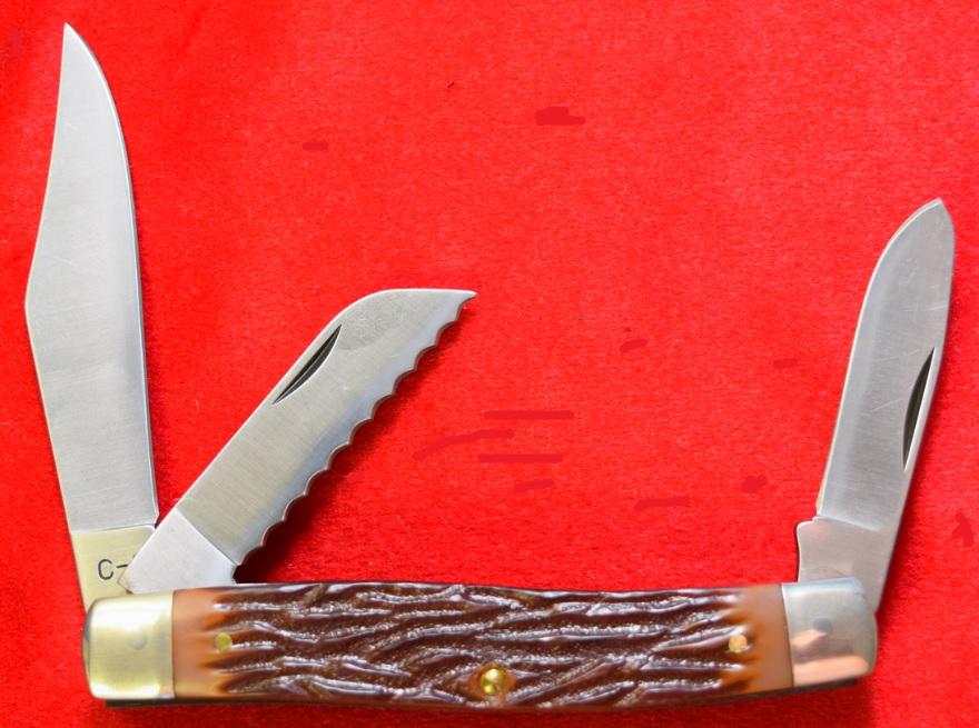 This is the Camillus Cartridge Series Model C-3 Rancher 3-Blade Stockman with Delrin handle scales. It features a centerfire .22 Hornet brass cartridge head inlay. Ranchers would likely carry a Stockman which has a Serpentine handle shape and Clip Point blade, a Sheep’s Foot blade, and a Spey Blade. The Clip Point is designed to be a general purpose blade, the Sheepsfoot blade was designed for trimming sheep’s hooves and the Spey blade was designed for spaying farm animals. This is high interest collector piece or a well made EDC.