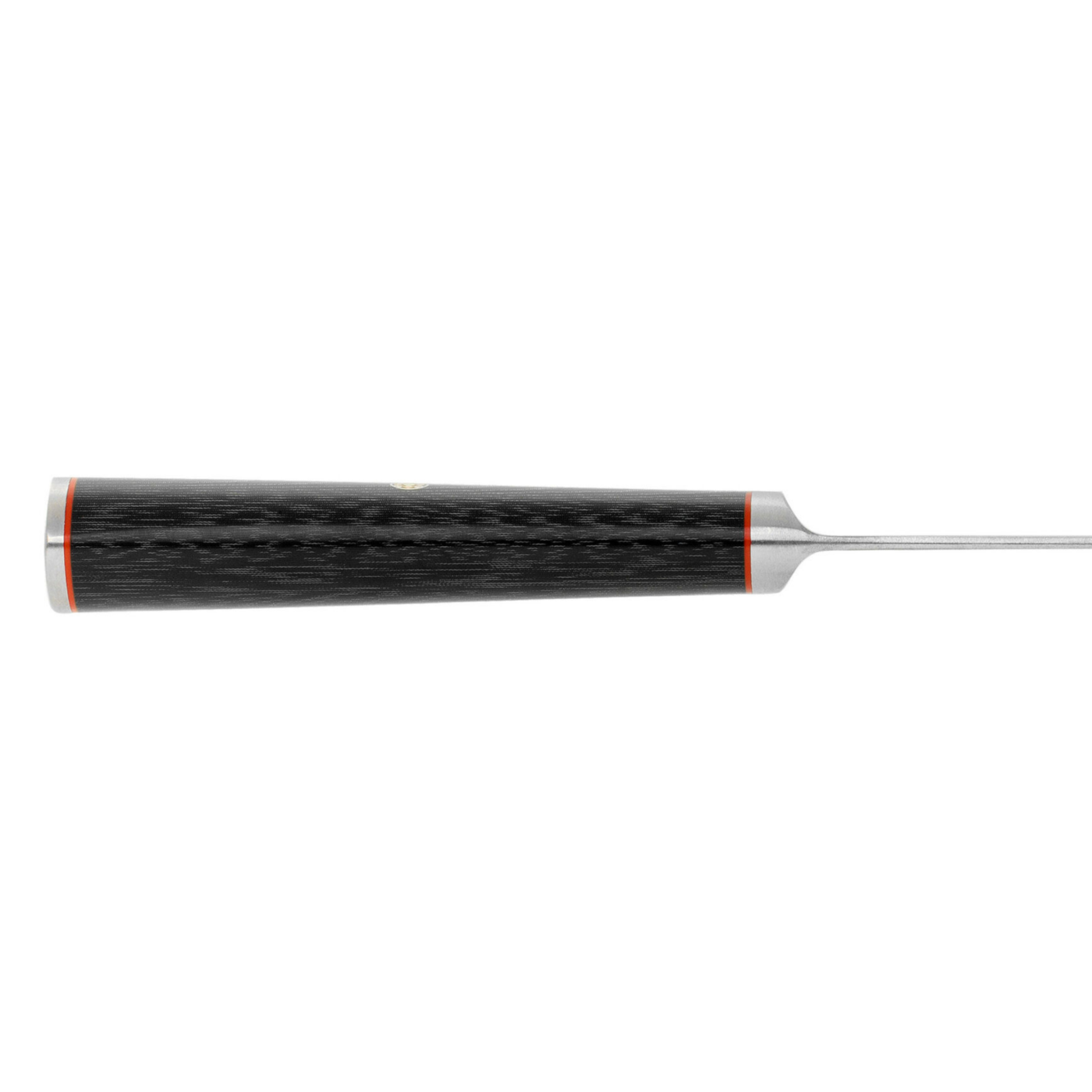 Each CRYODUR® ice-hardened blade undergoes the meticulous Honbazuke three-step hand-honing process, achieving a precise 9.5 degree to 12 degree cutting angle for scalpel-like sharpness. The traditional D-shaped black linen Micarta handle offers a comfortable, moisture-resistant grip with the refined look and feel of natural wood grain.