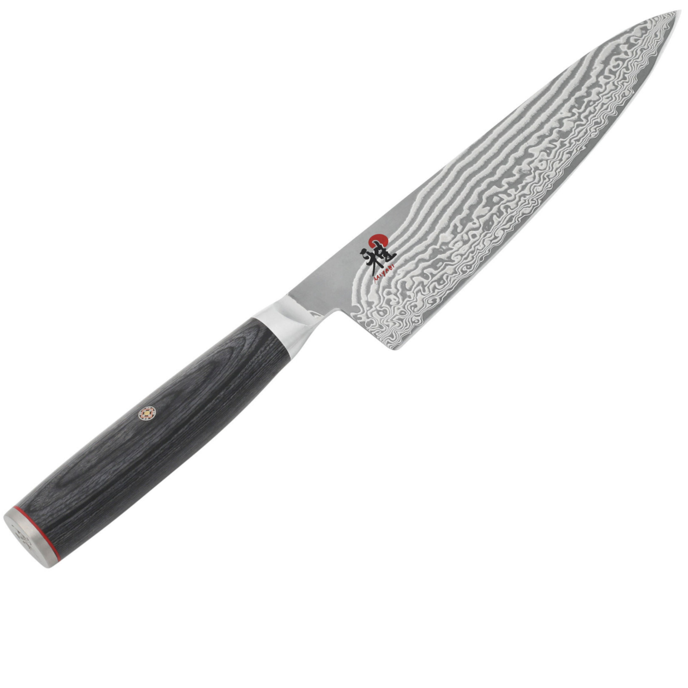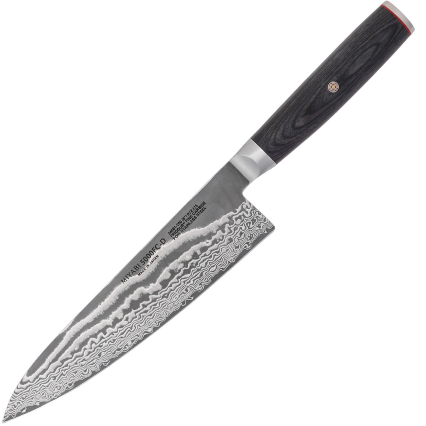 The elegant, ergonomic black pakkawood handle features a traditional Japanese D-shape for comfort and balance. Finished with a mosaic pin and MIYABI logo end cap, the handle offers secure, fatigue-free grip and refined craftsmanship that perfectly complements the artistry of the blade.