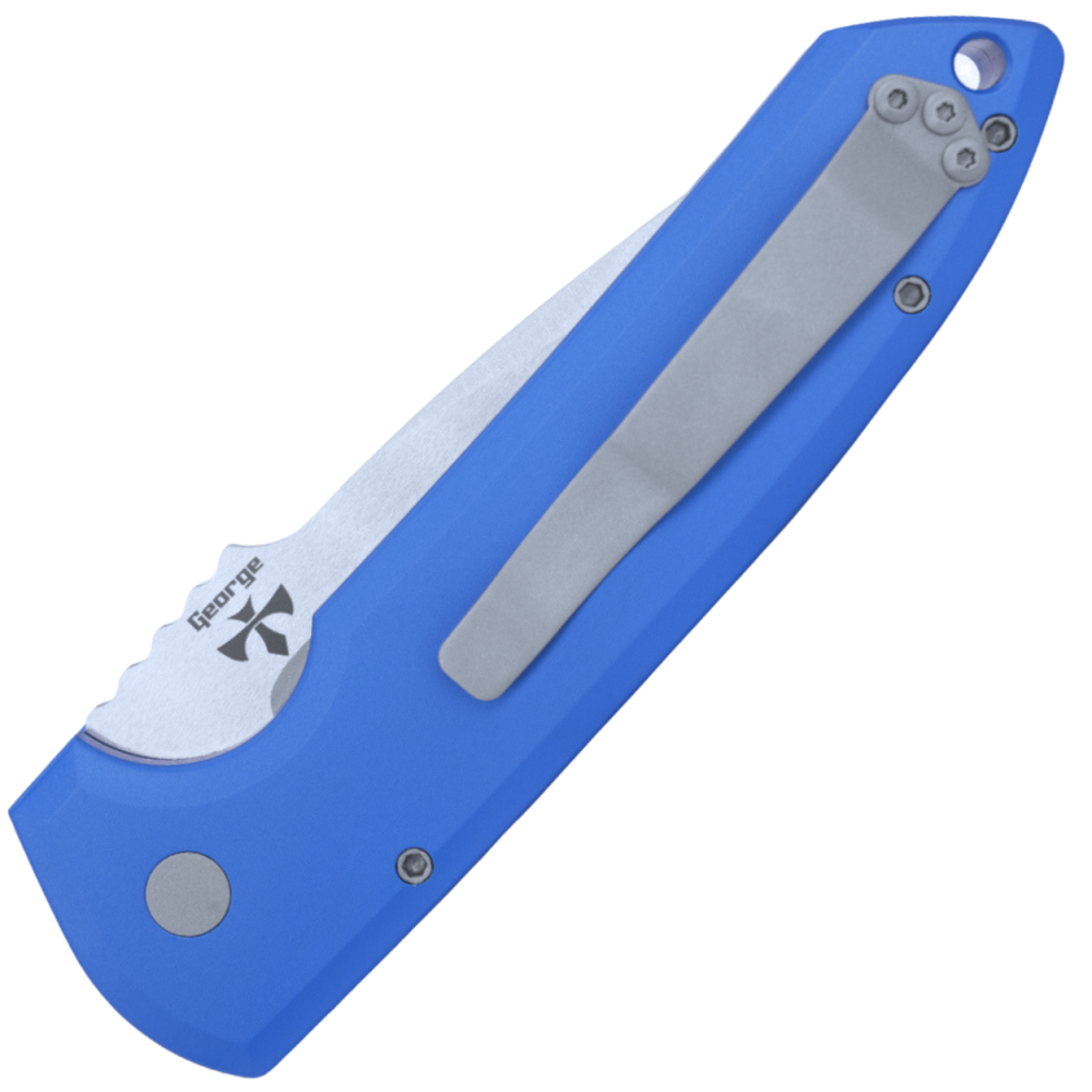 As a 10 year veteran of the United States Marines Les George trained in Explosive Dynamic Entry, Advanced Access and Disablement, Improvised Explosives and Devices, Weapons of Mass Destruction, Close Quarters Combat, and many other technical and tactical skills. All of this real world experience and a mind for quality of design has come together in this fantastic Rockeye Auto Folder. A sturdy, purposefully designed folder with the excellent design of Les George and the superior coil spring action that Pro-Tech is famous for! The Rockeye featuring solid blue hard coat anodized handles, stonewashed hardware, deep carry clip, and a stonewash blade in CPM-S35VN.