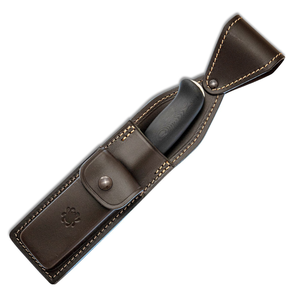 Designed by survival enthusiast Thomas Zoomer, the Zoomer is a highly evolved outdoor tool that transcends the functionality of traditional bushcraft knives. Its blade is expertly crafted from CPM-20CV and features a zero ground hamaguri (convex) edge. The unique handle design features two machined solid G10 scales that envelop the blade’s through tang, yet allow the butt of the tang to protrude for use as a hammer surface and lanyard attachment point. Its seamlessly contoured shape is devoid of hot spots and includes an extended thumb shelf for additional leverage. The Zoomer comes complete with a high-quality leather sheath that includes an on-board accessory pouch.